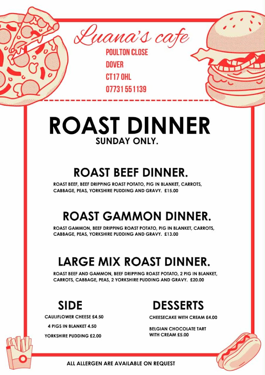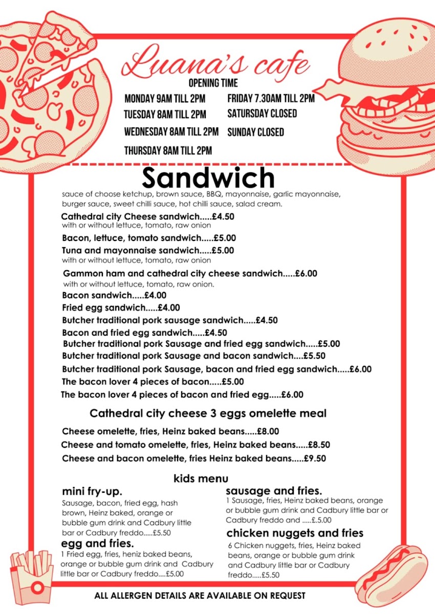 Luana's Cafe captures the essence of quintessential British dining with an array of offerings that cater to every palate. Whether you're craving a hearty breakfast to kickstart your day or a light midday snack, this cafe has you covered. Their star dishes include the Ultimate Cheesy Breakfast Baguette (£10.00), bursting with rich flavors and textures, and the ever-popular Butcher Traditional Pork Sausage and Fried Egg Sandwich (£5.00), which is a match made in breakfast heaven. Each mouthful is a celebration of culinary craftsmanship, featuring fresh, locally sourced ingredients that leave you wanting more.